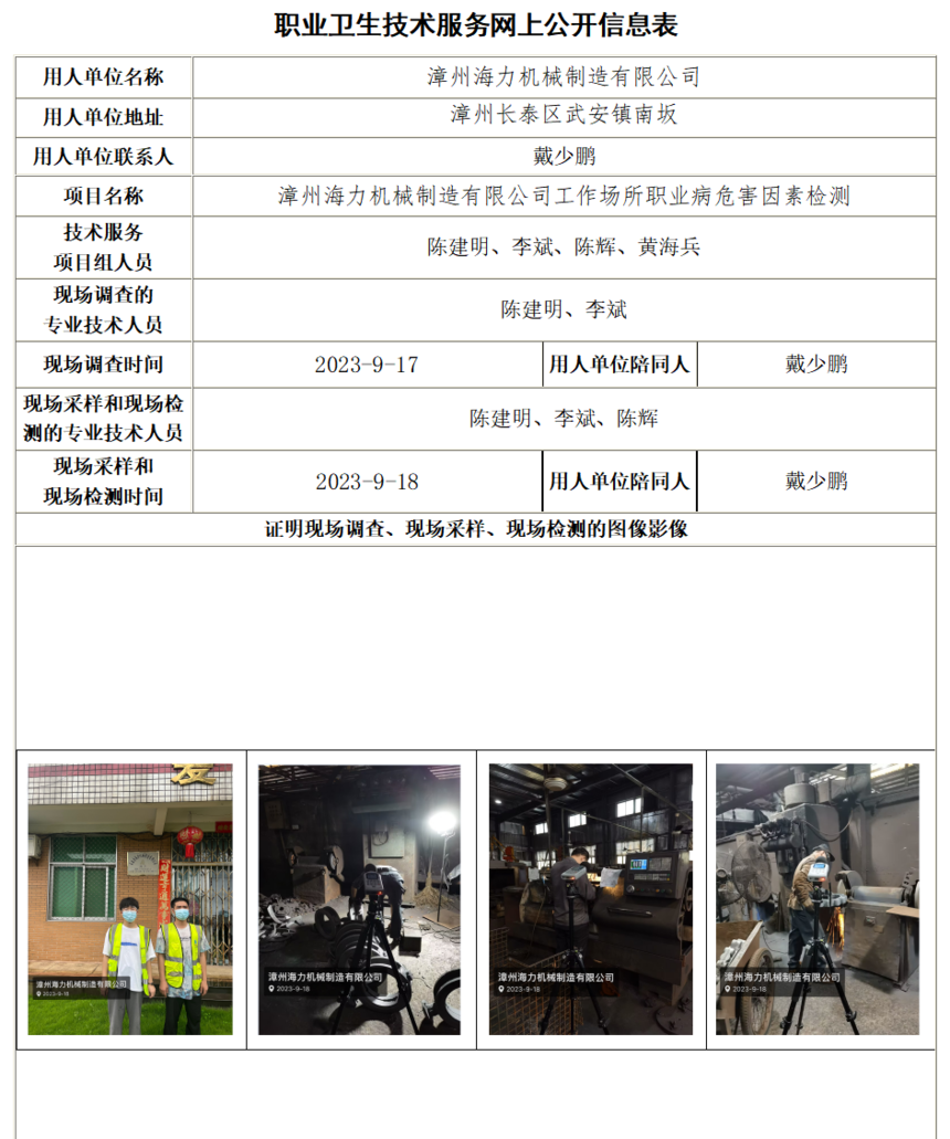 漳州海力機(jī)械制造有限公司工作場所職業(yè)病危害因素檢測